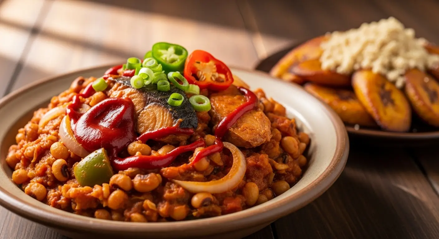 Fry onions in palm oil. Add tomato paste, chopped tomatoes, and spices. Stir in cooked beans. Simmer 15 minutes. Mash slightly. Fry ripe plantains on the side. Vegan and satisfying.