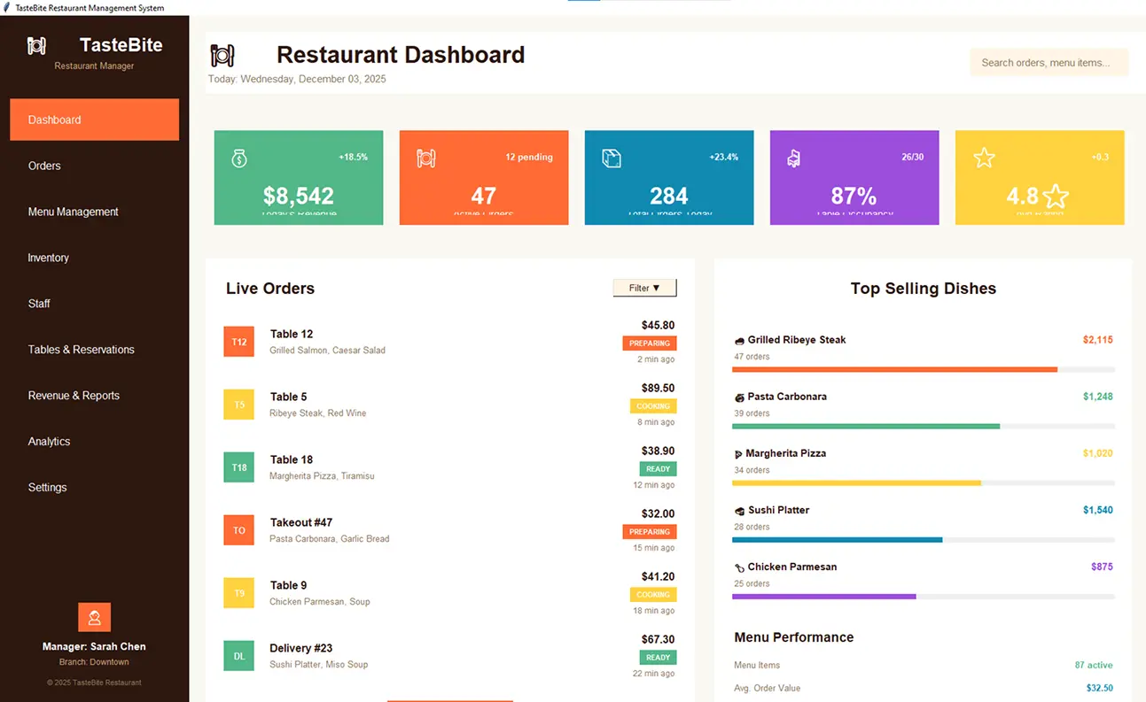 It includes menu updates, order processing, inventory alerts, billing, and sales reports.